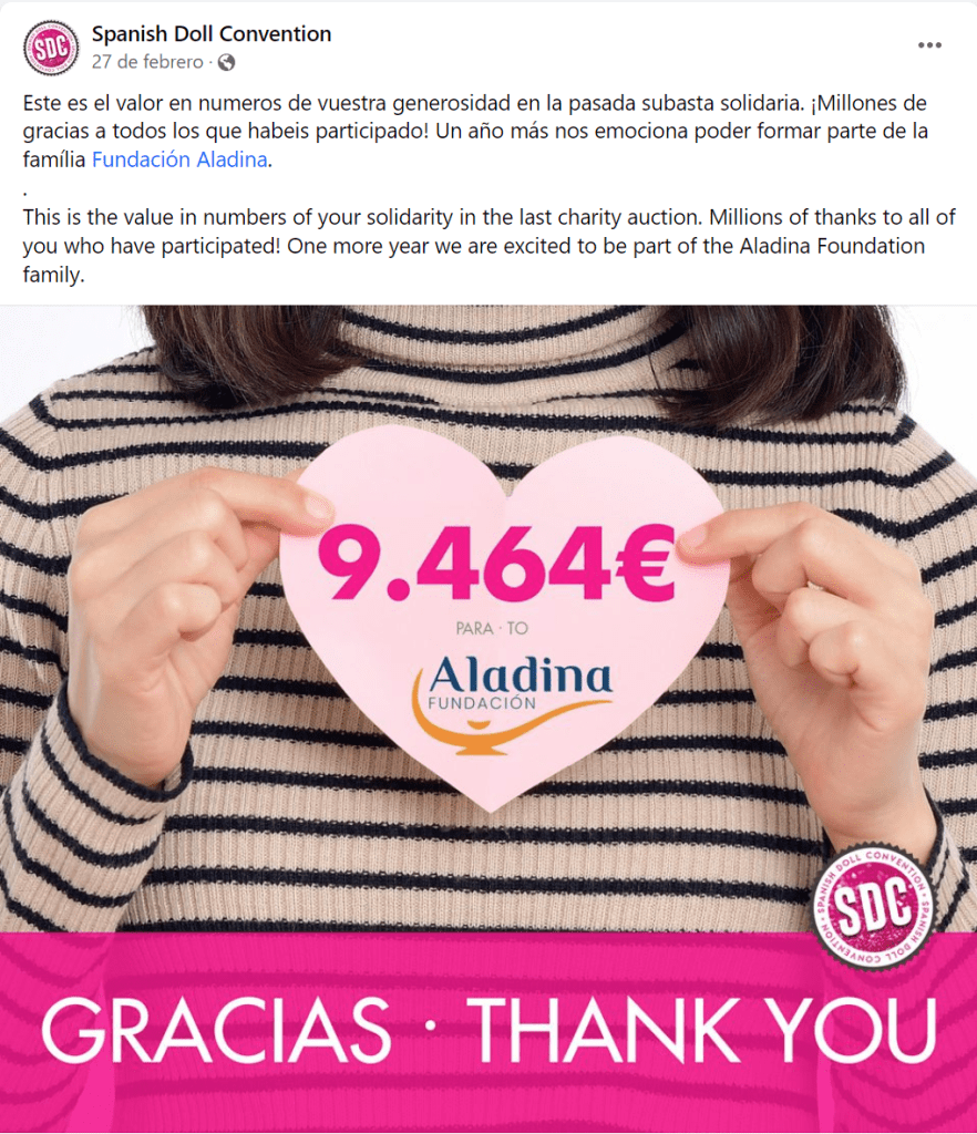 Parecía que no llegaba el día, pero aquí está, un año más, la subasta benéfica de la Spanish Doll Convention, donde el coleccionismo se conjuga con la solidaridad, de forma que podemos llevarnos a casa muñecas maravillosas, sabiendo que con ese dinero, además, cooperamos con una magnífica causa. Y la de este año no podía ser mejor. Y sí, volvemos a colaborar con la Fundación Aladina, dedicada a ayudar a niños y adolescentes enfermos de cáncer y a sus familias, pero además, el dinero recaudado en esta edición se destinará íntegramente al Fondo de Ayudas Extraordinarias de Aladina para apoyar a los niños con cáncer y sus familias afectados por la DANA. Como ya sabéis, el pasado octubre, sufrimos uno de los peores desastres naturales de las últimas décadas en España, que se cebó especialmente en la Comunidad Valenciana. Los daños han sido terribles, tanto personales como materiales y pensar que así podemos aliviar un poco el sufrimiento de los afectados, me hace muy feliz.